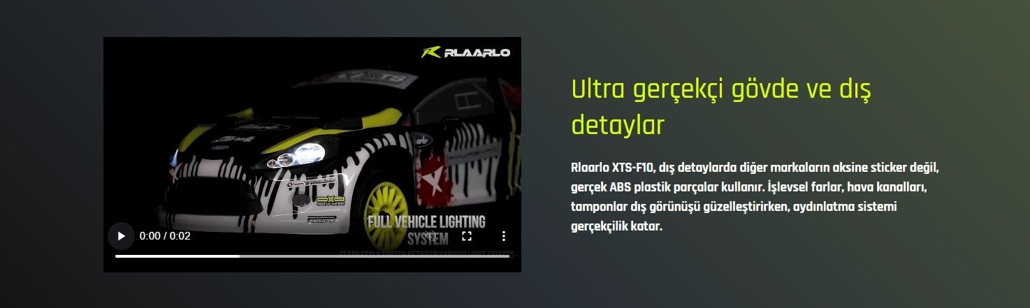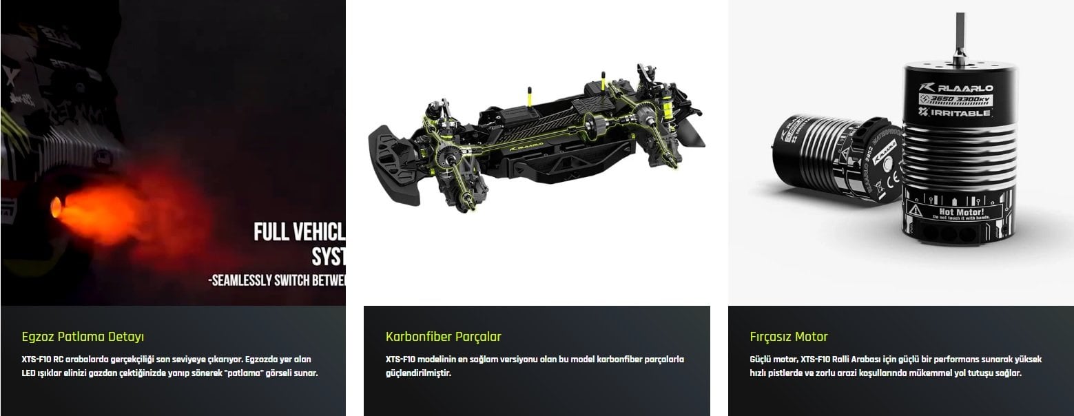 Rlaarlo XTS-F10, 1/10 ölçekli ralli performansının zirvesini temsil ediyor; karbon fiber şasi üzerine kurulu 3300KV fırçasız motoru sayesinde 80 km/saat üzerindeki hızlara meydan okur. Cayro (Jiroskop) destekli 4WD sistemi, ayarlanabilir metal amortisörler ve çelik aktarma organları ile bu araç, en zorlu zeminlerde bile eşsiz kontrol ve dayanıklılık sunmak üzere tasarlandı. Eğer gerçekçi bir ralli deneyimi, üstün mühendislik ve yüksek hız arayan bir tutkunsanız, XTS-F10 beklentilerinizin çok ötesine geçecek bir yarış makinesidir.