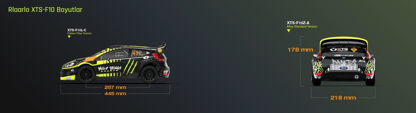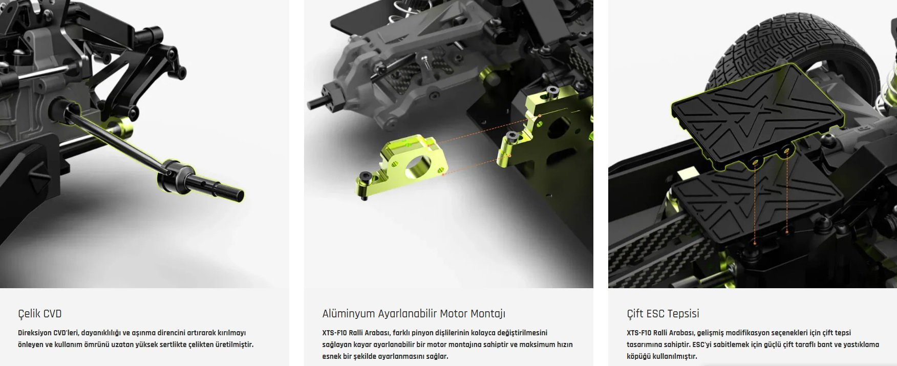XTS-F10 Rally Car, daha düzenli bir şasi kablolama yapısı ve dengeli ağırlık dağılımı sunar. Çift alıcı kutusu ve ESC tepsileri sayesinde çeşitli modifikasyonları destekleyerek kontrol ve stabiliteyi artırır.