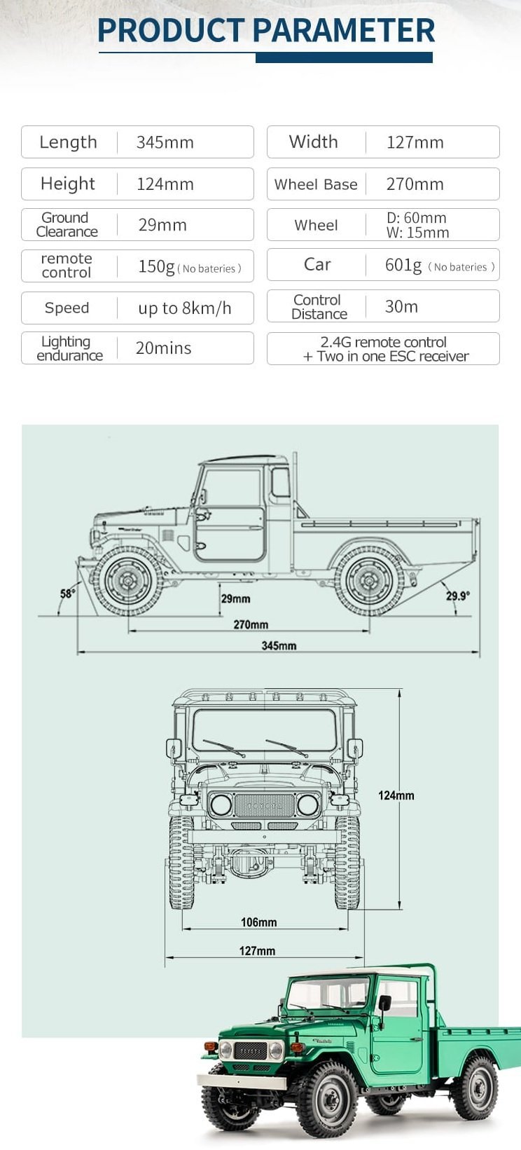 TOYOTA FJ45'in bu resmi lisanslı RC versiyonunu oluşturmak için FMS, gerçek arabayı son derece hassas bir şekilde restore eder ve restorasyon derecesi, statik modelinkinden daha az değildir.
