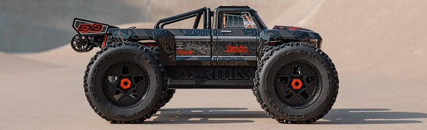 Tamamen monte edilmiş şasisi boyunca EXB ile sertleştirilmiş bileşenler, 1/5 ölçekli ARRMA® OUTCAST™ 8S EXtreme Bash Stunt Truck RTR'ye neredeyse durdurulamaz bir güç kazandırır.