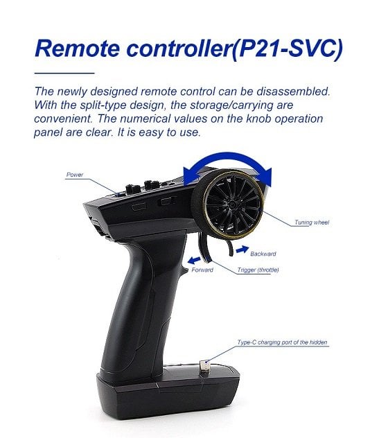 Kanal 1 ve kanal 2 için tam oranlama özelliği, size kontrol konusunda tam bir hassasiyet sunar. Pakete P21SVC 4CH uzaktan kumanda dahildir ve bu kumandanın tutacak kısmı çıkarılabilir özelliktedir.