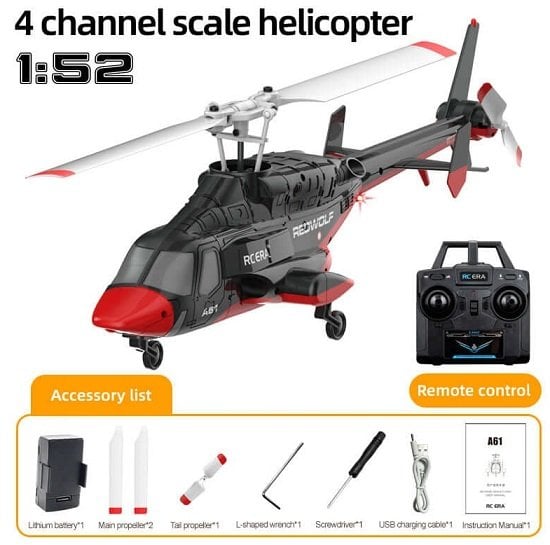RC ERA A61 Airwolf, fabrikada tamamen kurulmuş halde gönderilen tam donanımlı bir RTF (Ready-To-Fly) paketidir. Kumanda, alıcı, batarya ve tüm elektronik ekipman hazır kurulu şekilde gelir; kutudan çıkar çıkmaz uçuş yapmaya başlayabilirsiniz.