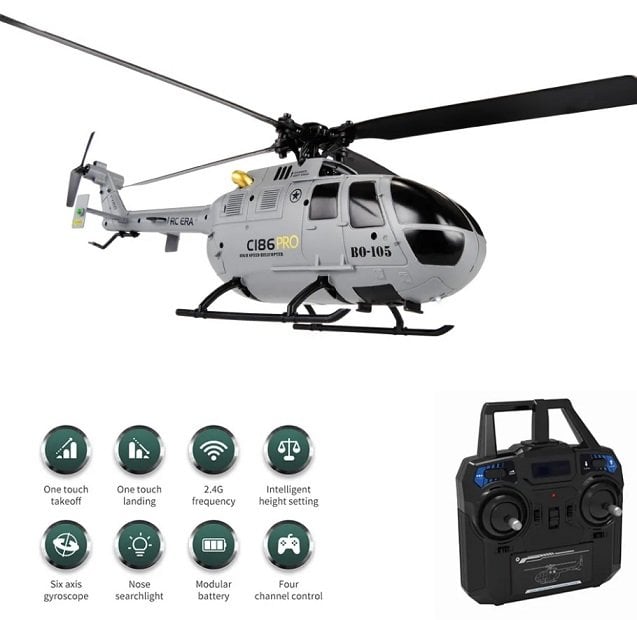 RC ERA C186 Pro BO105, gelişmiş 6 eksen gyroskop, barometrik irtifa sabitleme, aerodinamik flybarless tasarım ve modüler batarya sistemi ile hem yeni başlayanlar hem de deneyimli kullanıcılar için ultra stabil ve kontrolü kolay bir RC helikopter deneyimi sunar. Gerçek BO105 helikopterinden esinlenen ölçekli tasarımı ile hem uçuş hem de sergileme amaçlı mükemmel bir modeldir.
