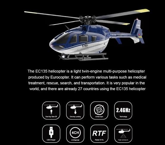 RC ERA C187, aileronless (flybarless) tasarımı, 6 eksen gyro stabilizasyonu ve barometrik irtifa sabitleme özelliği ile hem yeni başlayanlar hem de deneyimli kullanıcılar için ultra stabil ve kontrolü kolay bir RC helikopter modelidir. Aerodinamik optimize edilmiş rotor yapısı, güçlü uçuş, düşük titreşim ve hassas kontrol sunar.