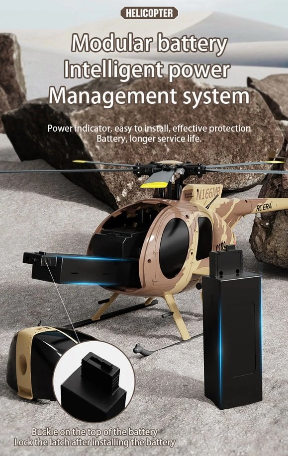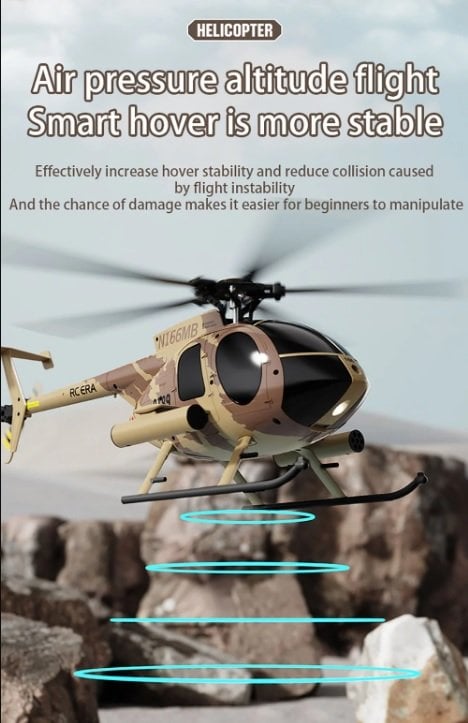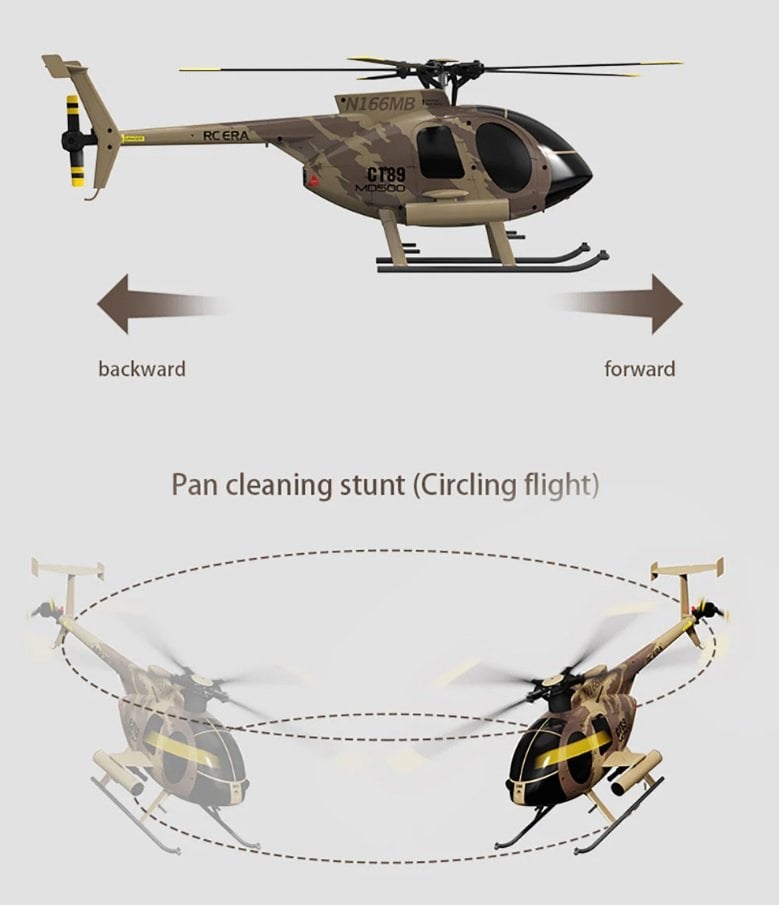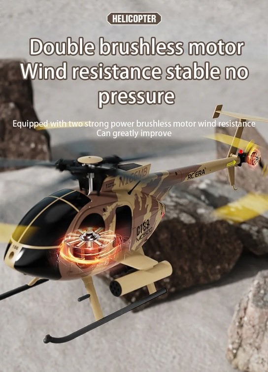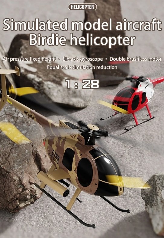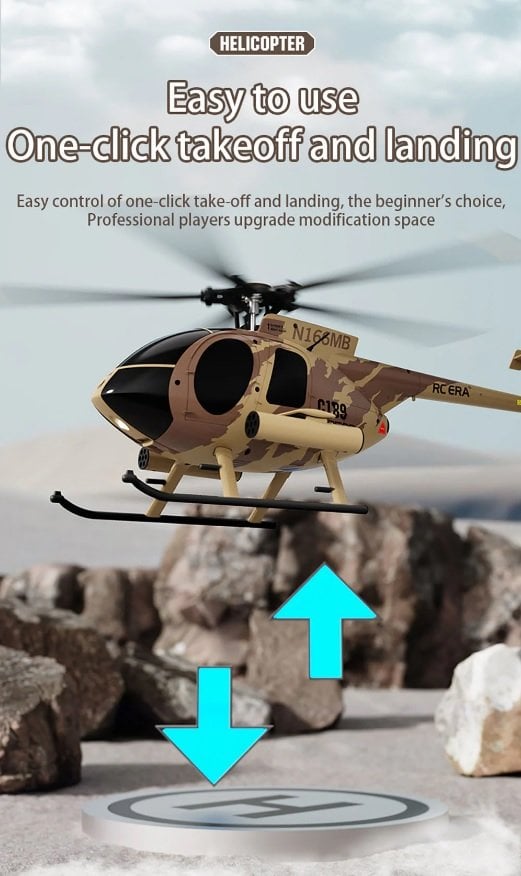 RC ERA C189, efsanevi MD500 helikopterinin 1:28 ölçekli yüksek detaylı tasarımıyla üretilmiş, çift brushless motorlu, 6 kanallı, flybarless yapıda üstün performanslı bir RC helikopter modelidir. Aerodinamik rotor sistemi, 6 eksen gyro stabilizasyonu, barometrik irtifa koruma ve opsiyonel optik akış pozisyonlama sayesinde hem yeni başlayanlar hem de ileri seviye pilotlar için ultra stabil bir uçuş deneyimi sunar.