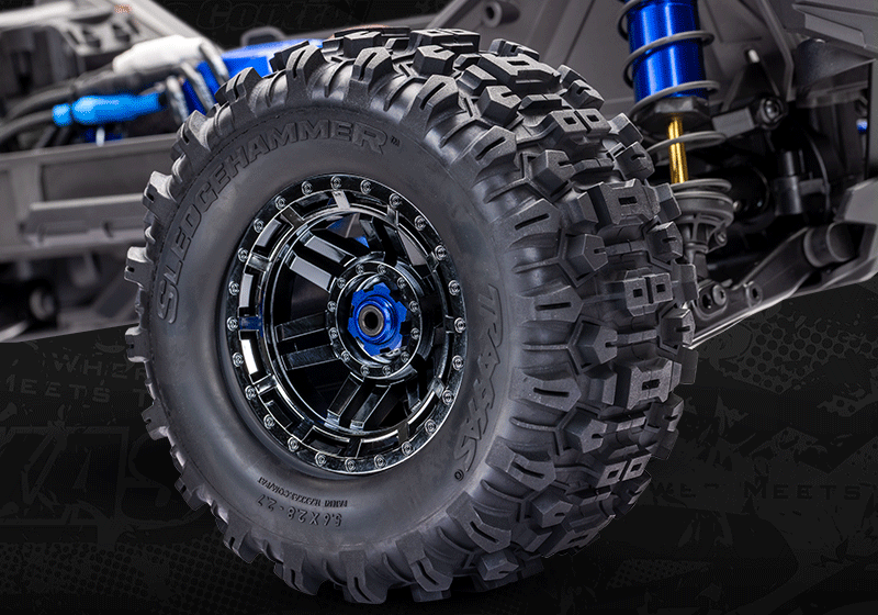 Devasa 5,6 inçlik Sledgehammer lastikleri, çamur ve döküntüleri temizleyerek rakipsiz çekiş sağlayan agresif, açık bloklu bir diş desenine sahiptir. Yeni siyah krom jantlar, Maxx'e rakipsiz performansına uygun, tehditkar bir görünüm kazandırıyor. 2,8 inçlik jantlar, alüminyum akslara daha güçlü bir bağlantı için yivli 17 mm altıgen bağlantı kullanıyor.