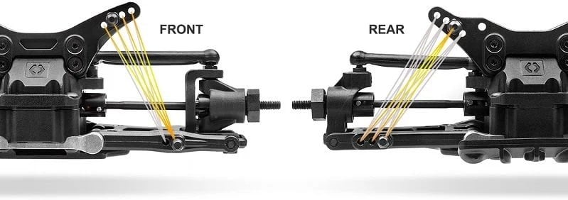 Performans test ayarlanabilir çift zil Krank sistemi optimum direksiyon hassasiyeti sağlar Hızlar. Metal bir sürükleme bağlantı plakası krankları ekstra için bağlar dayanıklılık, ek drag link montaj pozisyonları Ayrıca Ackermann açı ayarlamalarına da izin verir.