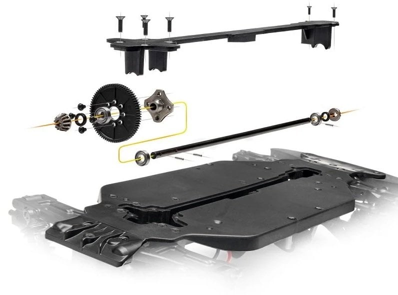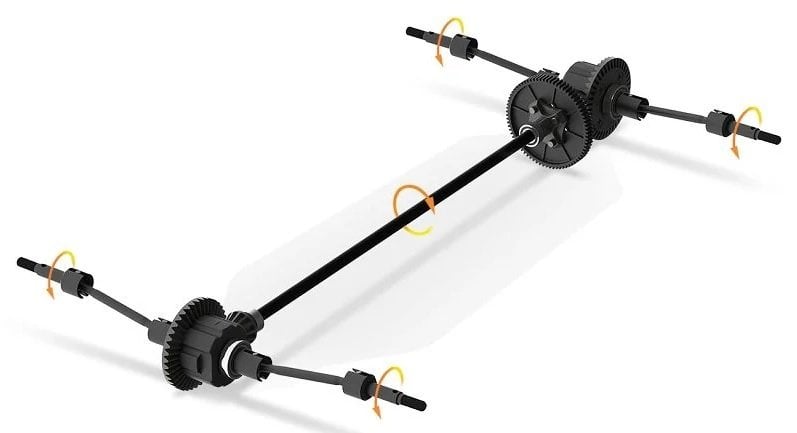 Araba transfer gücünün her bir ucunda dişli diferansiyelleri Sürücüden her birini süren dogbone'lere ve akslara - Tekerlek. Tüm metal inşaat, aktarma yapısının kolay aktarılmasına izin verir. Ve güçlü fırçasız motorlara dayanır. Kauçuk mühürlü bilyalı rulmanlar diferansiyelleri destekler