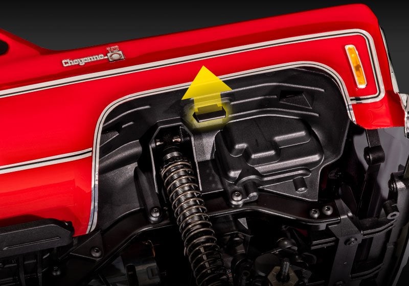 K10'in klipssiz gövdesi patikada sıkı durur ancak kasaya erişmek için saniyeler içinde serbest kalır. Bu gizli kilitleme sistemi, gövdenin temiz hatlarını kesintiye uğratabilen geleneksel gövde klipslerini kaldırarak TRX-4'e yeni bir rahatlık düzeyi ve gerçekçilik katıyor.
