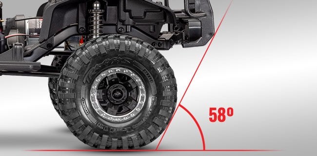 Kutusundan çıktığı haliyle tam 57,93° ön yaklaşma açısına sahip olan TRX-4, adeta duvarlara tırmanmaya hazır. Aynı şekilde etkileyici olan 46,50° uzaklaşma açısı, en derin çukurlarda ve en zorlu engellerde bile aracın arkasını vurmadan geçmesini sağlayarak size ekstrem bir arazi kabiliyeti sunar.