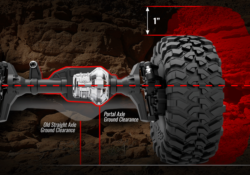 Portal akslar, aracı tekerlek merkezlerinden yukarı kaldırarak gövde altında devasa bir yerden yükseklik (karın altı mesafesi) sağlar. Bu yüksekliğe standart akslarla ulaşmak isteseydiniz, TRX-4 Pathfinder üzerindeki lastiklerden yaklaşık 2,5 cm daha büyük lastikler takmanız gerekirdi.